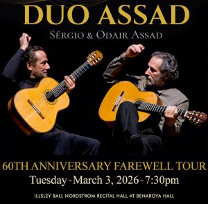 As they prepare to conclude six decades of international touring, Duo Assad will grace the stage at Benaroya Hall in Seattle for a final farewell performance, where they will share with us their phenomenal music-making one last time.